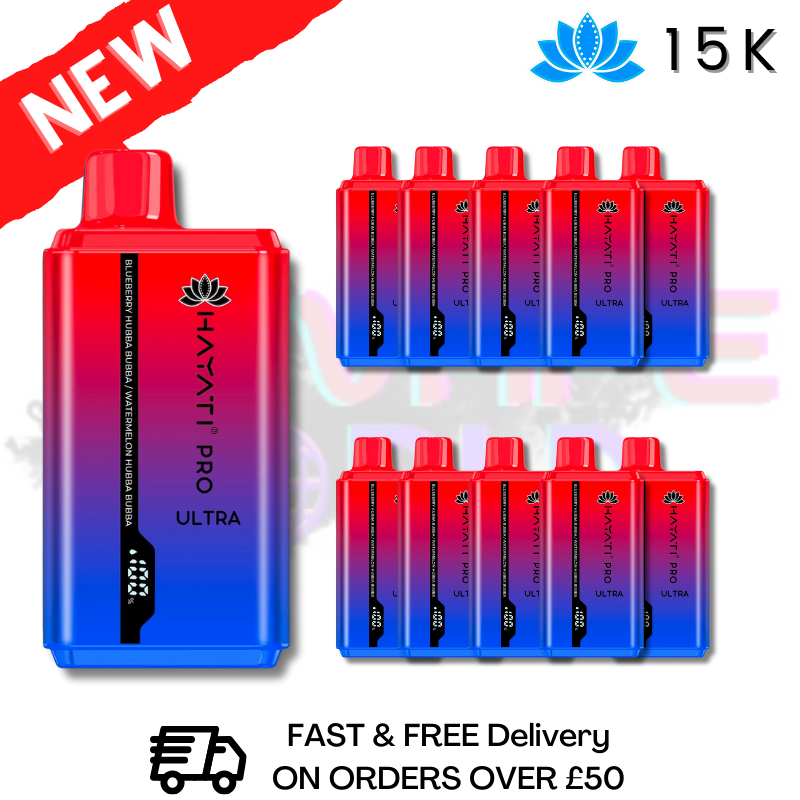 Blueberry Hubba Bubba / Watermelon Hubba Bubba Hayati Ultra Pro 15000 Puff 15K Bar Twist Disposable Box / Pack Of 10 is a whimsical vape with the essence of sweet and fruity blueberry bubblegum, delivering a chewy cloud that's both playful and delightful.