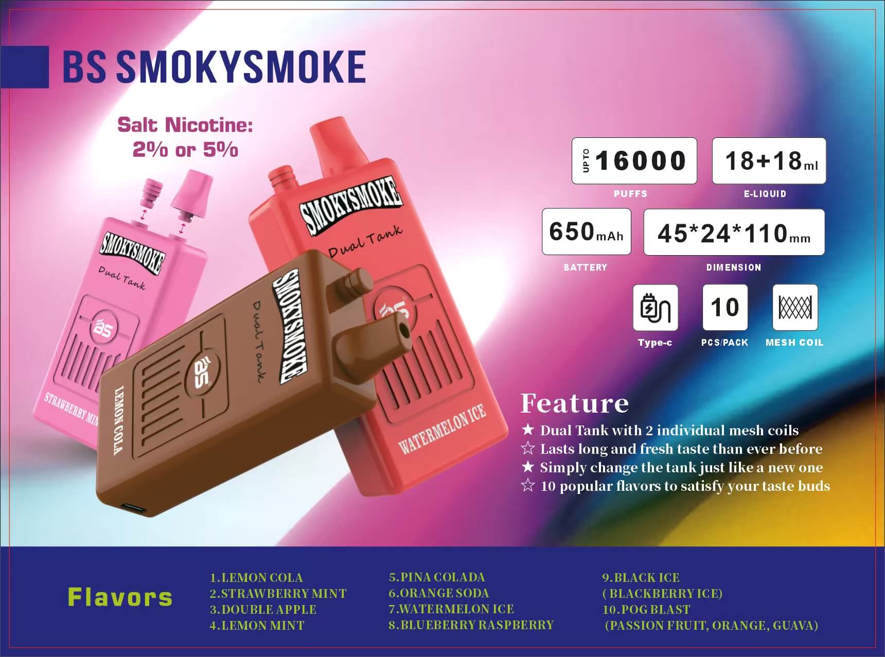 The BS SMOKYSMOKE 16000 Vape is the perfect companion for any occasion. Whether you're on the go. hanging out with friends. or relaxing at home. this vape offers 16.000 puffs with its dual 32ml e-liquid tanks. With a rechargeable 650mAh battery. adjustable airflow. and a smooth. flavorful experience. it's ideal for those who want hassle-free vaping. Its leak-proof design ensures reliability for outdoor activities. while its variety of flavors makes it perfect for social settings. Enjoy convenience. flavor. and style—anywhere. anytime—with the BS SMOKYSMOKE 16000 Vape.