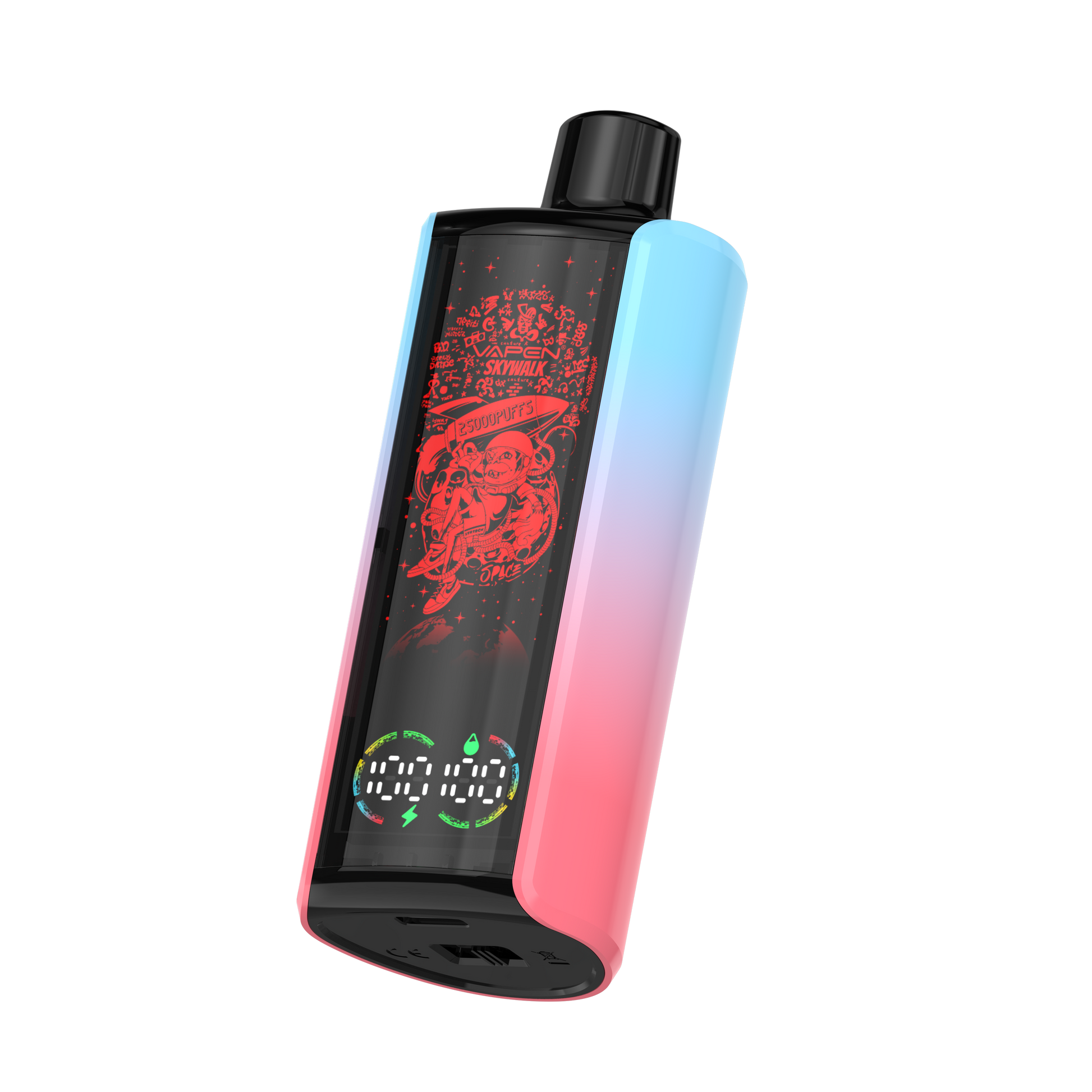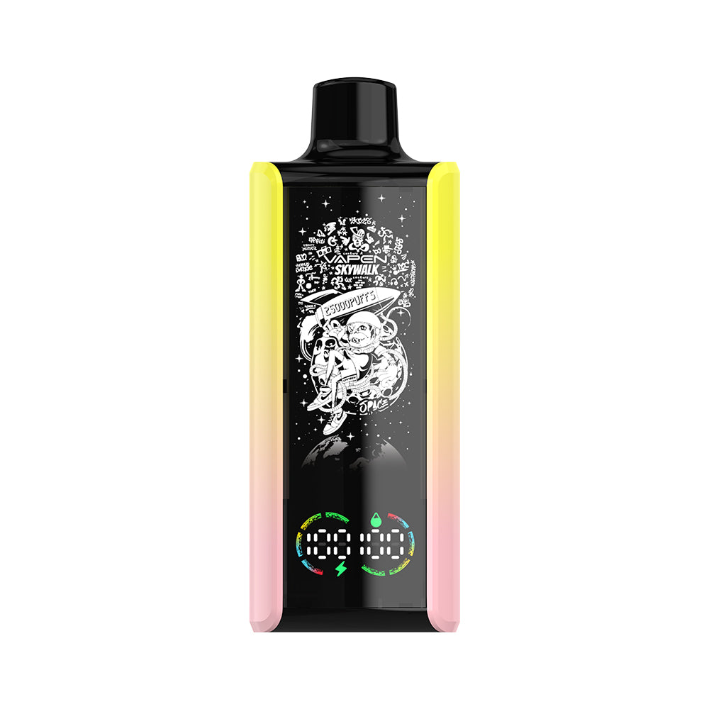 The VAPEN SKYWALK 25K puff is a stylish disposable vape featuring a 30ml e-liquid capacity and a huge puff count of 25.000 puffs. With a 650mAh battery. Type-C charging. and adjustable airflow. it combines fashion and technology. The device features a smart oil and battery display. allowing users to easily monitor e-liquid levels and battery status. It also lights up with RGB colors during use and uses low-resistance mesh coils and consistent taste technology for a stable flavor experience.