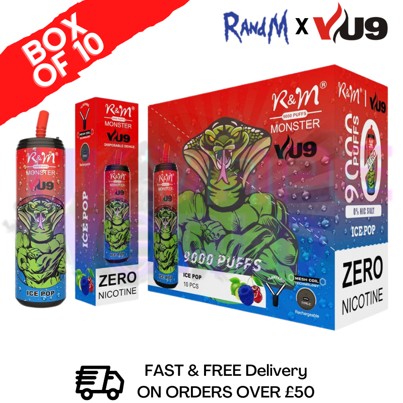 ICE Pop (NEW) - Experience the brand new blend of cherry with an icy twist in monster 9000 Puff Bar with the R and M Pack of 10 Vape Pen