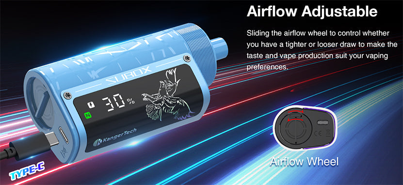 Kanger Subox 50K Disposable Kit is powered by a built-in 900mAh battery with Type-C charging. There are normal/boost mode for your option. It features 0.5% strength, 0.5Ω resistance, 40ml capacity and up to 50K puffs. Equipped with display screen, it can show you the necessary vaping info like battery/oil status and power output mode. It is also designed with adjustable airflow to bring you tighter or looser draw and suits your vaping preference.