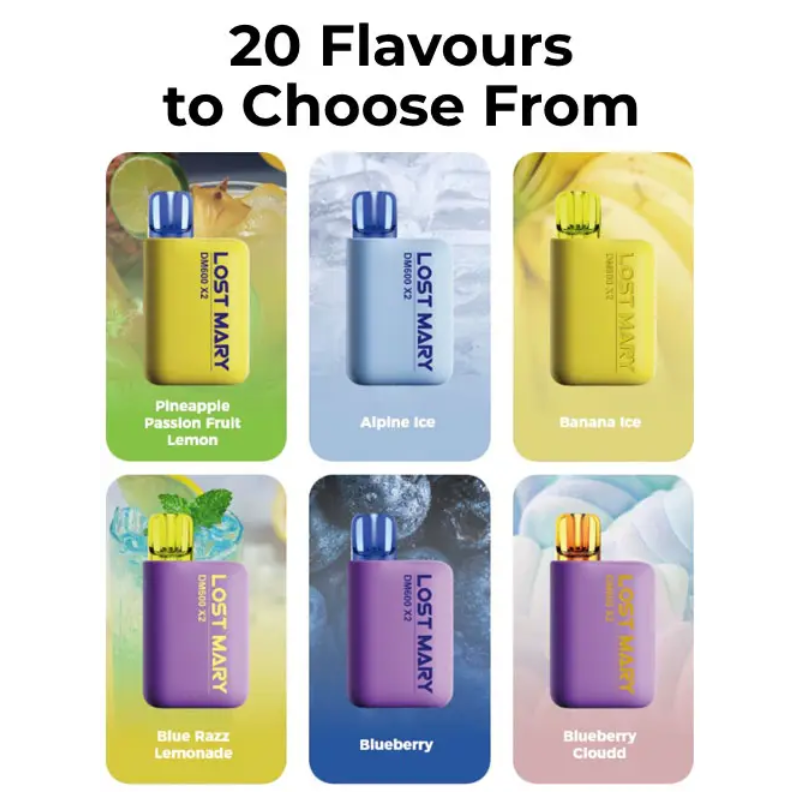 The Lost Mary DM1200 offers a wide range of flavours, including Lemon Lime, Pineapple ICE, Blueberry, Blue Razz Lemonade, Pineapple Passionfruit Lemon, Mix Berries, Grape, Kiwi Passionfruit Guava, Maryturbo, Alpine ICE, Strawberry ICE, Banana ICE, Blueberry Cloud, Red Cherry, and Western Tobacco.