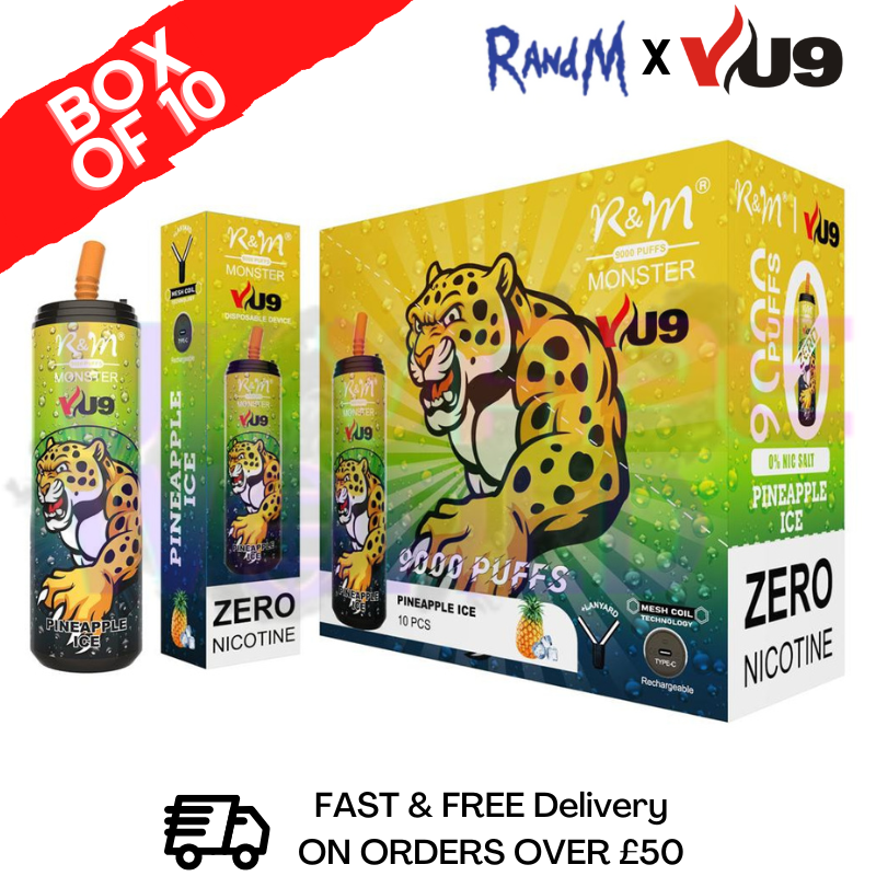 Pineapple ICE (NEW) - Experience the brand new blend of pineapple with an icy in monster 9000 Puff Bar with the R and M Pack of 10 Vape Pen