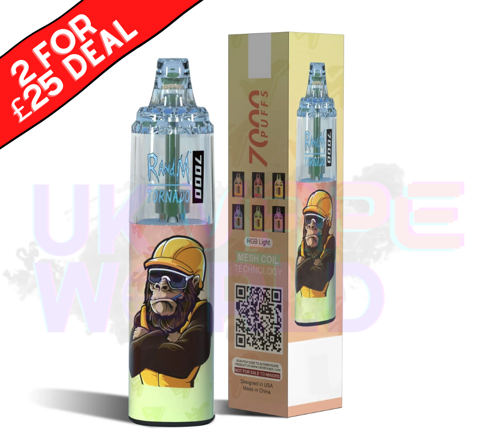 RandM Tornado 7000 disposable pen device offers a smooth and pure taste available in a plethora of fruity fresh flavours, fueled by a inbuilt 1000mAh battery and approx. 7000 puffs of vaping.