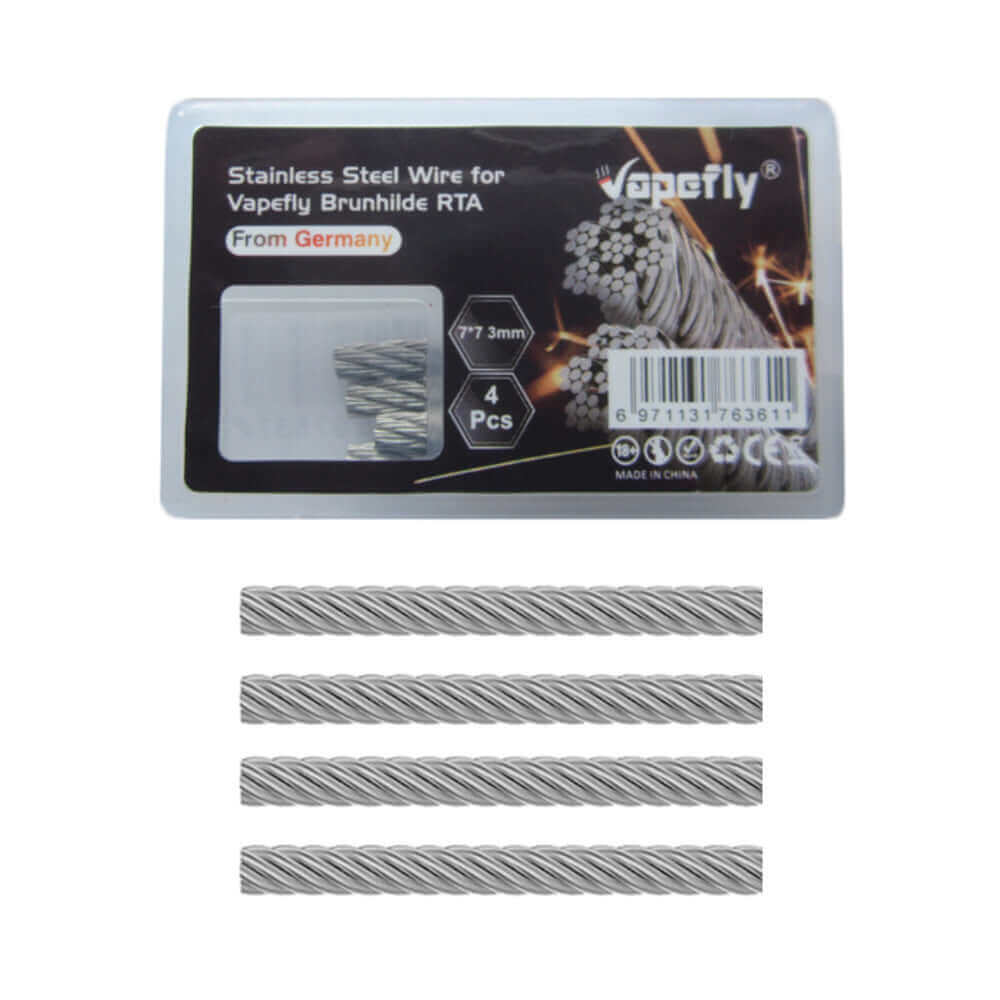 Tyto kabely byly navrženy pro rebuildable atomizér VAPEFLY Brunhilde RTA. Jsou vyrobeny z nerezové oceli z Německa. Každý kabel se skládá z 7 propletení po 7 pramenech a má průměr 3 mm. Prodáváno v balení po 4 kusech.