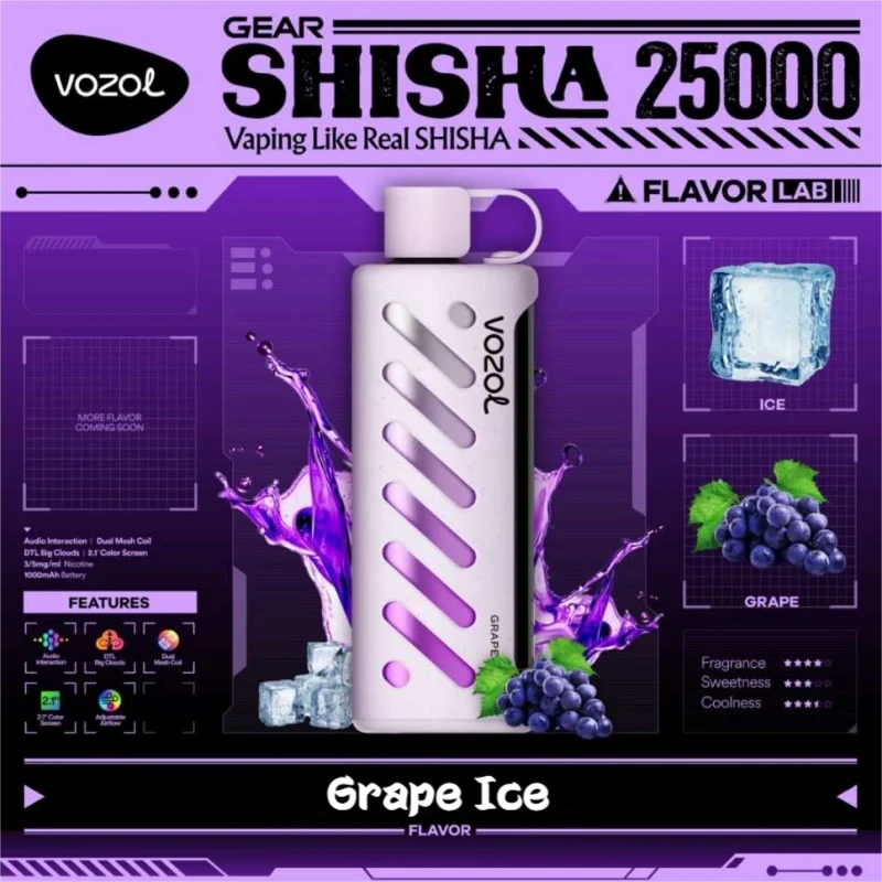 Gear Shisha 25k vape of Vozol have 25ml e-liquid capacity, delivers up to 25,000 puffs, ensuring long-lasting satisfaction without the need for frequent replacements. A powerful 1000mAh battery provides extended usage, while the LED display keeps you informed about battery life and e-liquid levels in real time.