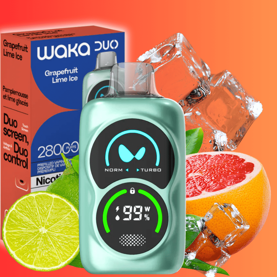 Pucker up for the WAKA Duo 28000 Disposable Vape in Grapefruit Lime Ice. Inhale and taste the tart juice of fresh grapefruit, followed by fresh squeezed lime juice. Then, a kiss of ice leaves on the exhale making this sour delight hard to put down! Enjoy a burst of sunshine in every puff.