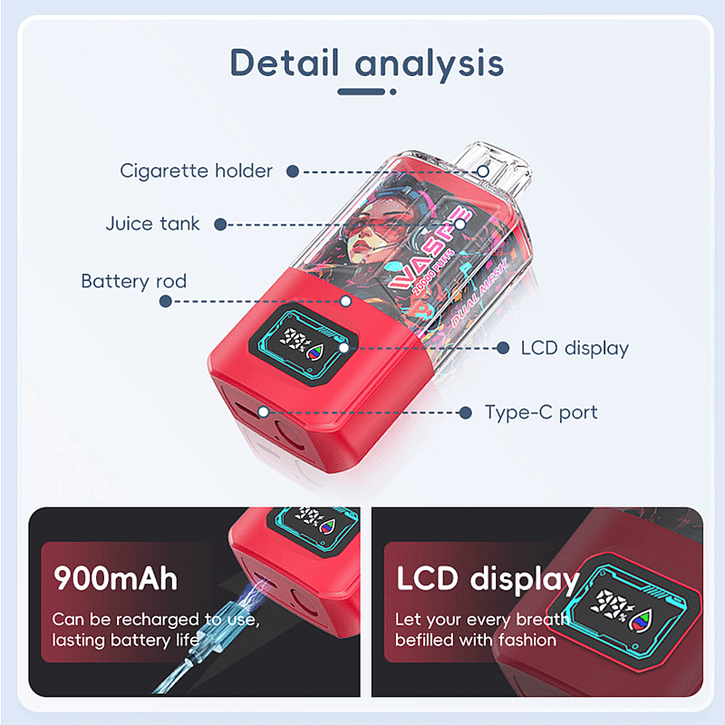Powered by a robust 900mAh rechargeable battery (112040), this device ensures reliable performance throughout its lifespan. The Type-C port allows for quick and efficient recharging, minimizing downtime. An innovative LCD display provides essential information such as battery life and e-liquid levels, making it easy to monitor and manage your device.