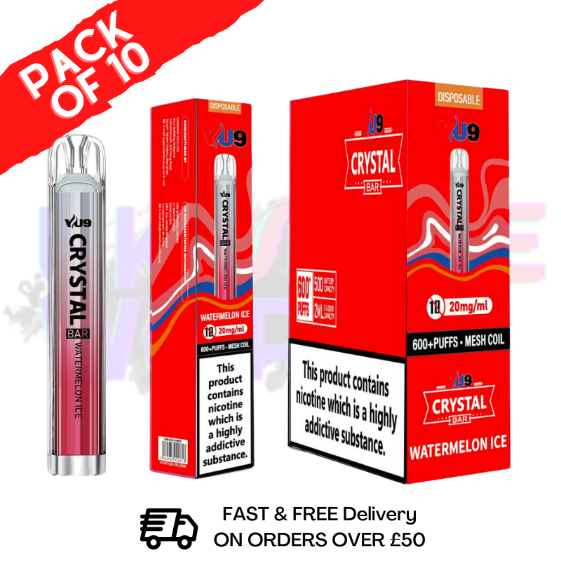 Watermelon On ICE Crystal VU9 Classic Pack Of 10 Cheap Disposable is a blend with a lush base with a frosty twist, delivering a refreshing and cool vaping experience with fruity allure and icy invigoration VU9 600 Range!
