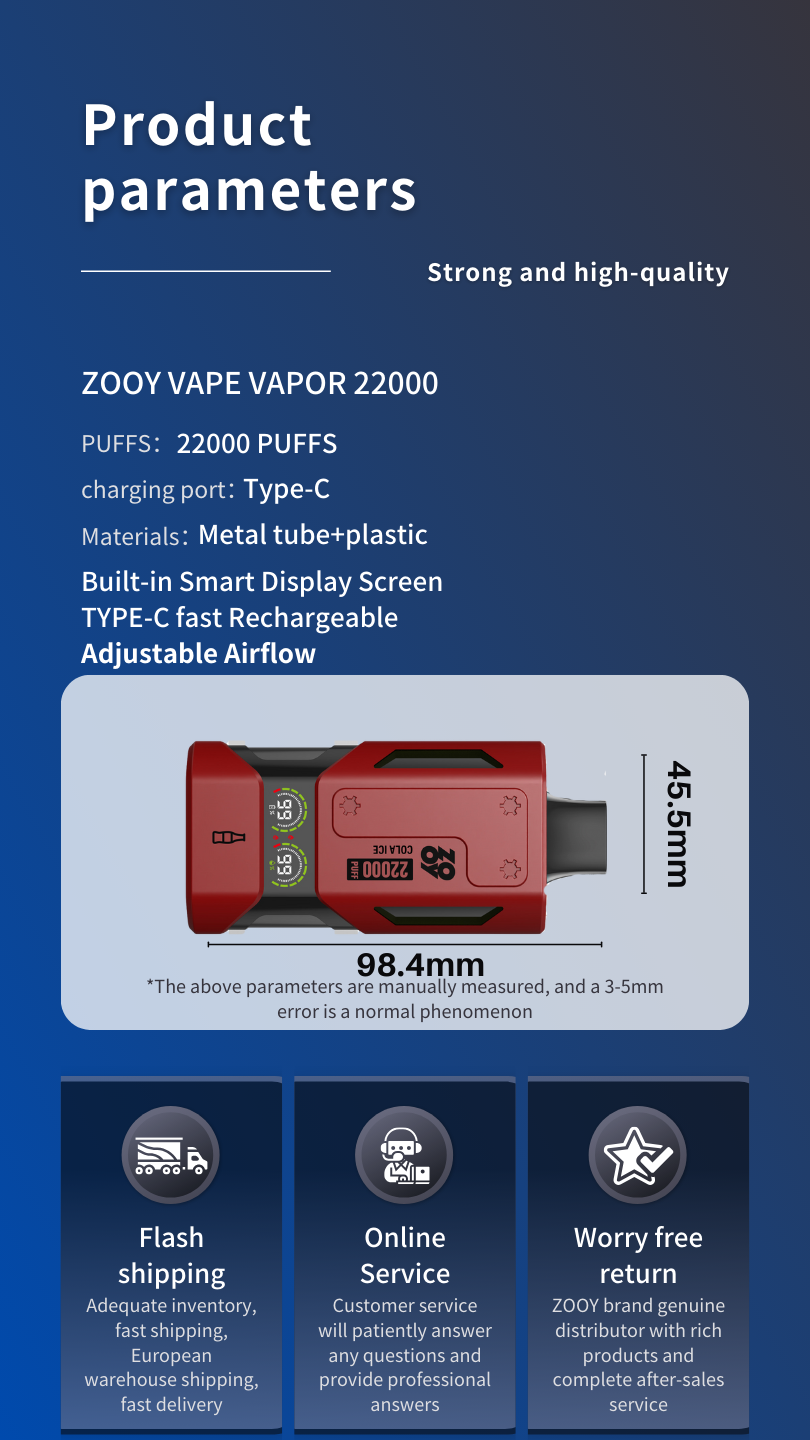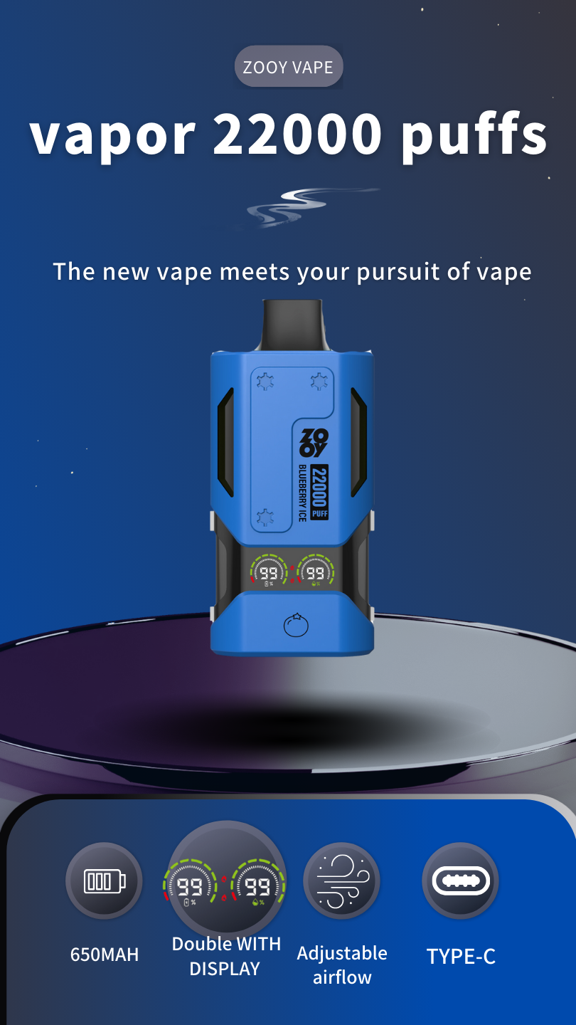 Zooy Vape Vapor 22000 Puffs 22k Disposable Wholesale E Cigarette With Dual Led Screen